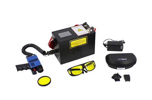 接下来,王工向大家演示设备的操作方法。按一下主机电源开关,5秒之后就开机了。设备主机有3.5英寸屏幕,开机界面有中英文选择。主机连接上445nm蓝光激光头后,设备能自动识别所连接的激光头是哪一种。点击屏幕上出现的图标,屏幕将提示操作者所需佩戴眼镜的颜色。戴上防护眼镜后,按住激光头上的开关就可以开始工作了。功率从10%~100%在屏幕上可以滑动调节。电池可以连续使用8小时。产品体积很小,重量极轻,主机仅有2.4千克,长时间手提操作也不会感觉累。